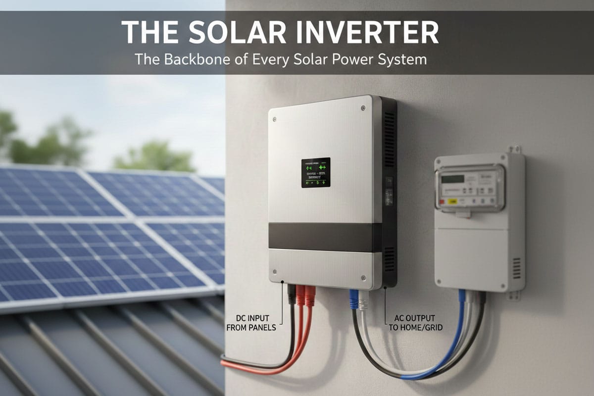 A solar inverter is the device that converts Direct Current (DC) electricity produced by solar panels into Alternating Current (AC) electricity used in homes and businesses.